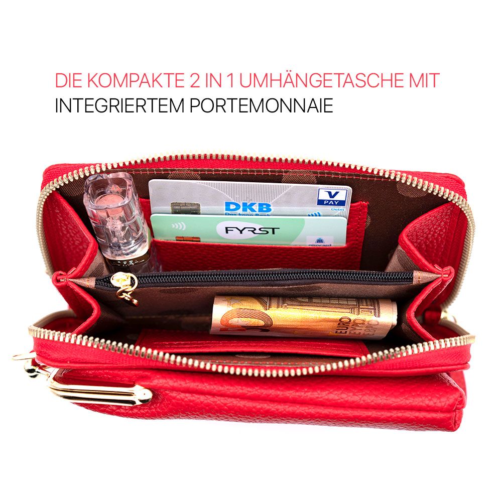 GUT ORGANISIERT IST DAS GANZE LEBEN - Diese kompakte Handy Umhängetasche verfügt neben einem Fach für das Smartphone und eine Portemonnaie Sektion über insgesamt 6 verschiedene Fächern für Bargeld sowie Kreditkarten und andere Utensilien.