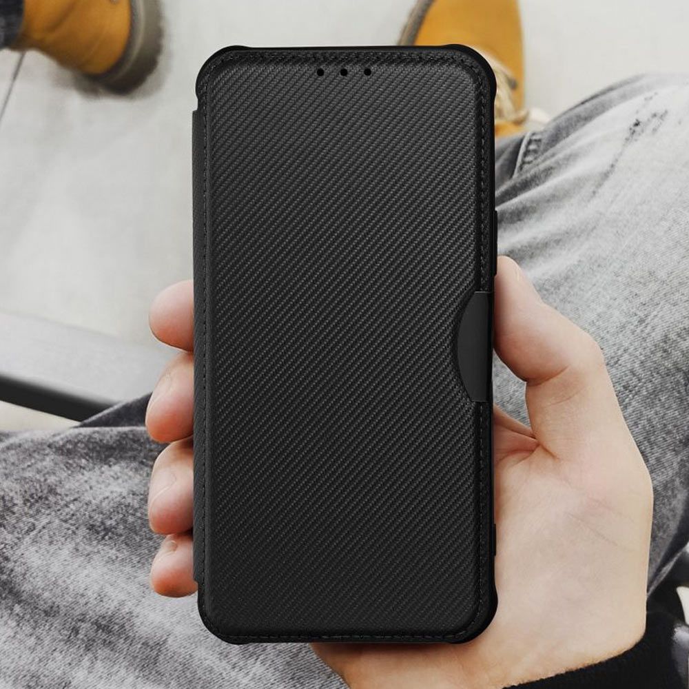 HOHE QUALITÄT: Sehr hochwertige und handverarbeitete Handytasche für Samsung Galaxy A57 (5G) in edler Carbon Optik mit Magnetverschluss.